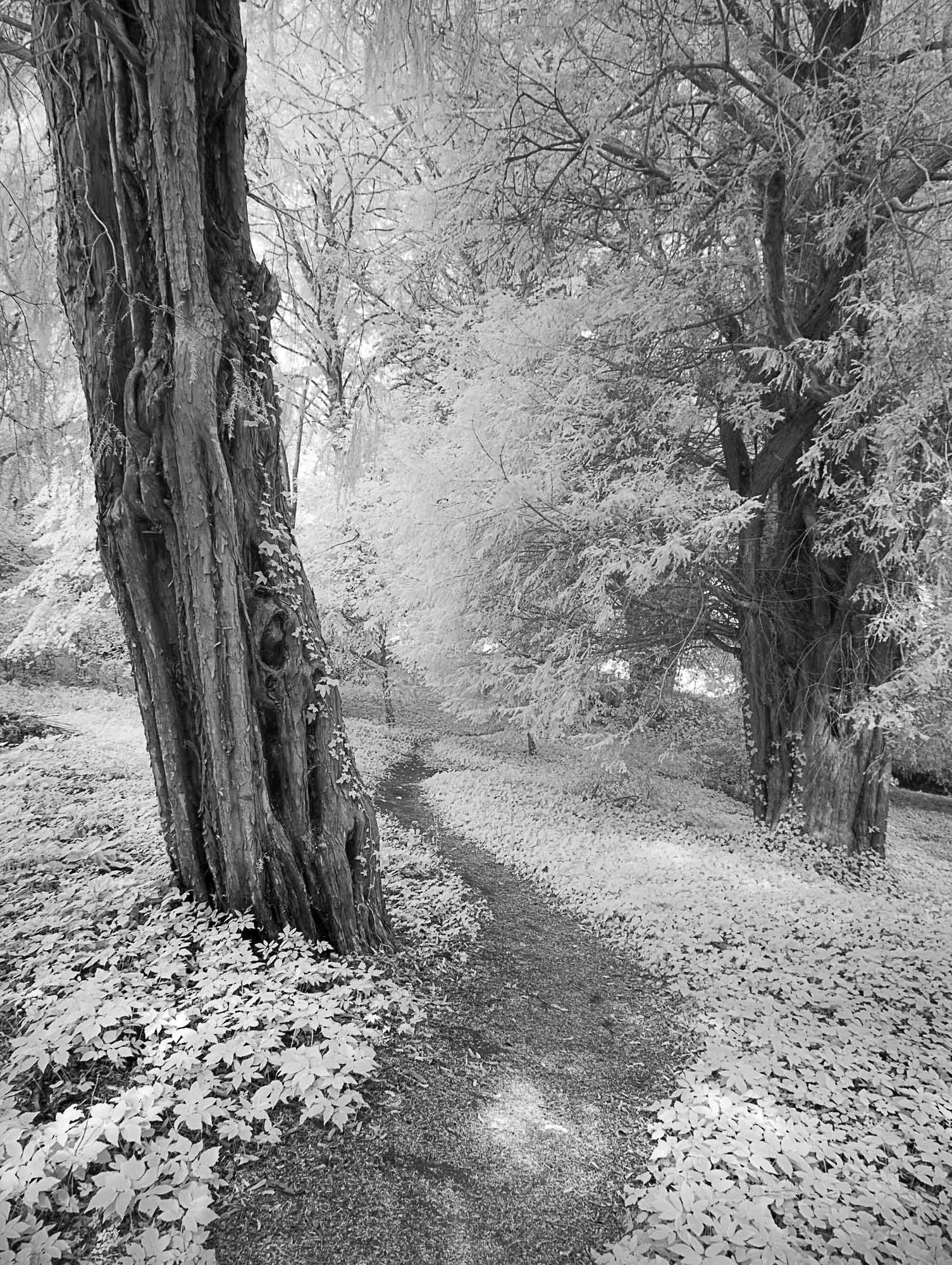 This is ivy glowing white in the forest floor and creeping up the tree. The yew tree and its leaves are unusual for IR photography, in the fact they remain dark. This makes for a compelling contrast in this scene.