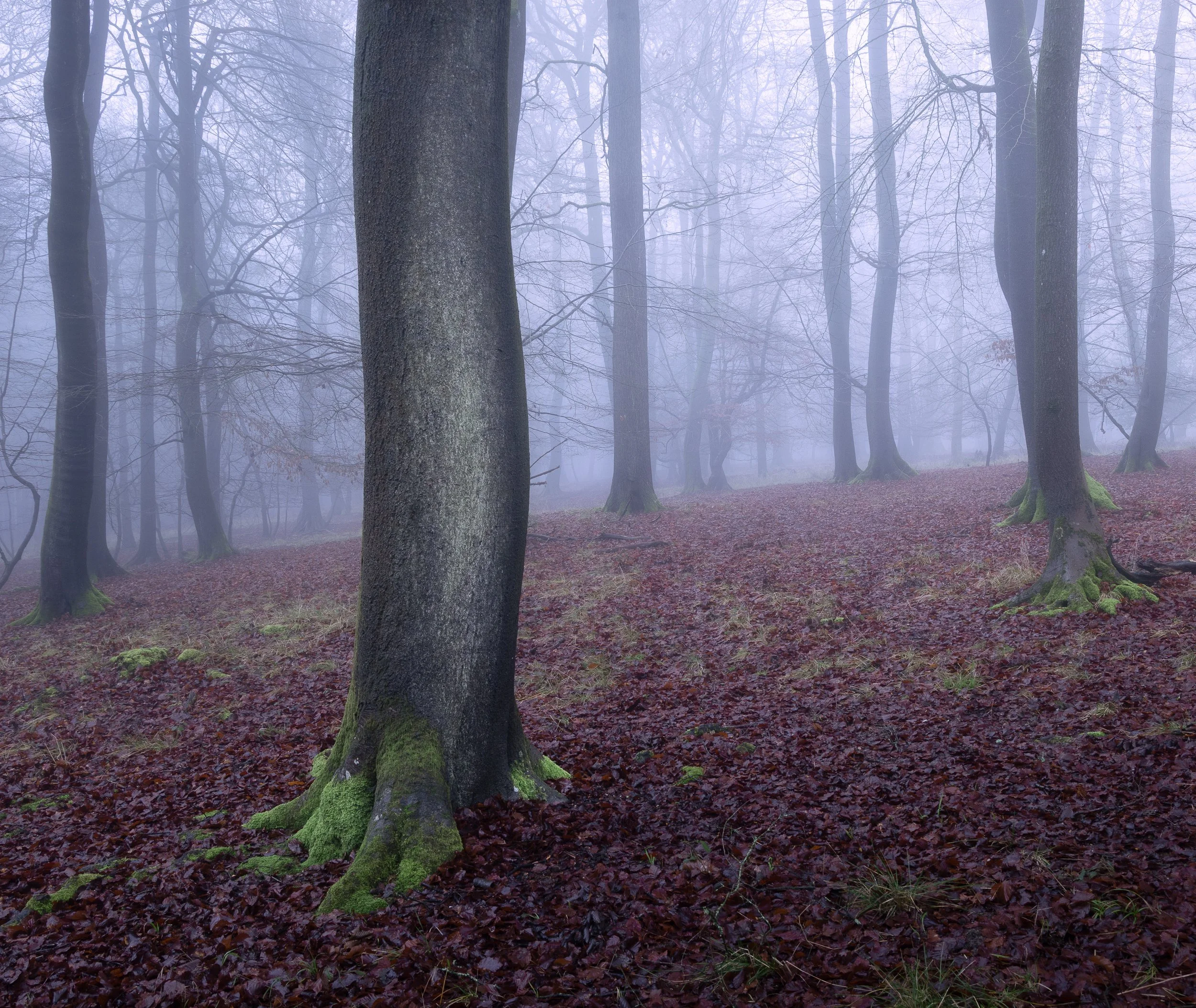 Beech woods are different. Straight trunks. Gentle curves. More rhythm. It is always best to seek out the trees with the lovely S bends in the lower trunks. The S bend has a particular importance for the human eye and so your viewer will be drawn to this, which is a key compositional idea in woodland photography.