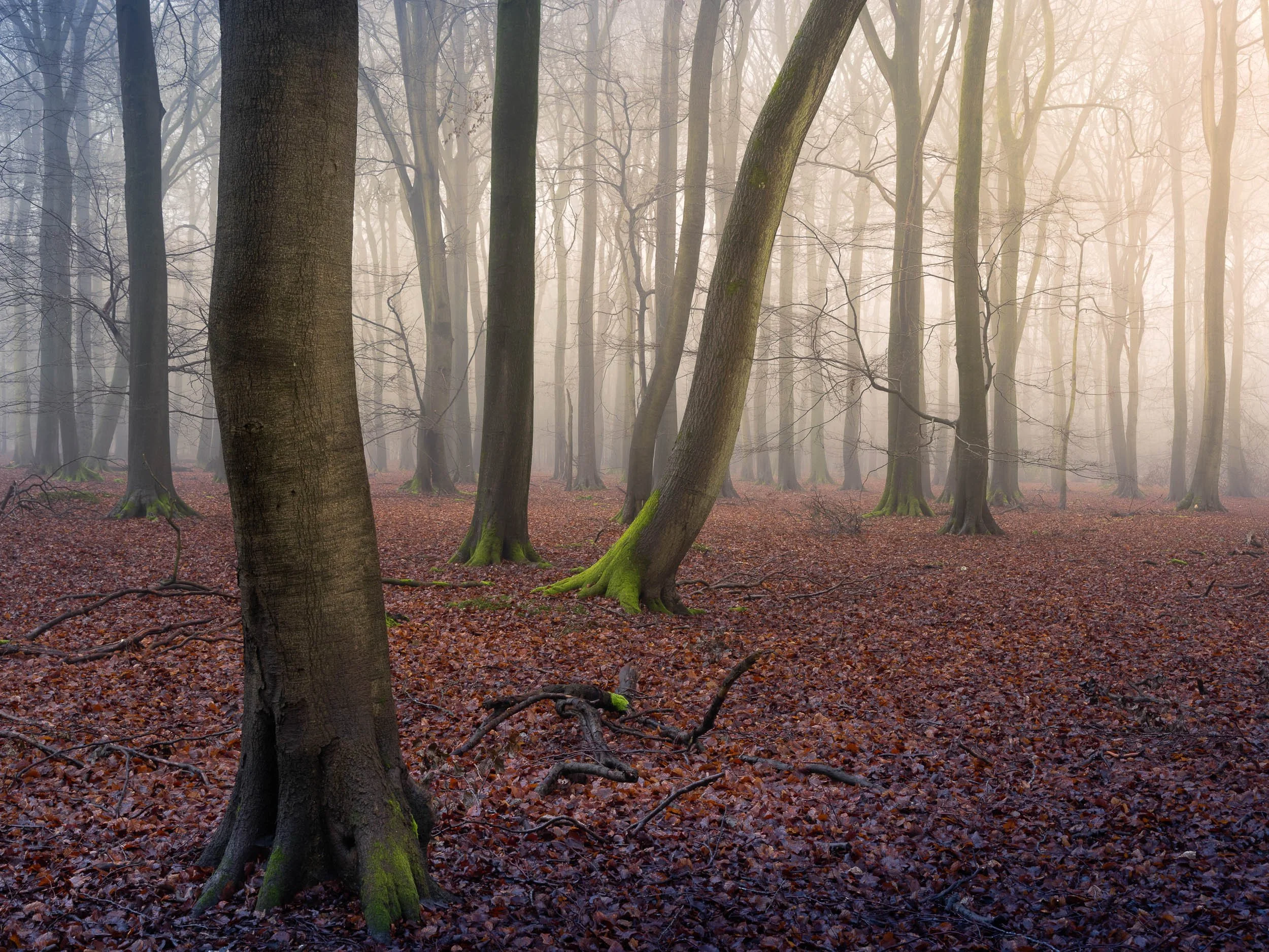 Young beech trees often retain their leaves longer (that coppery colour). It adds one of the only natural colours you’ll reliably get in winter woodland photography.